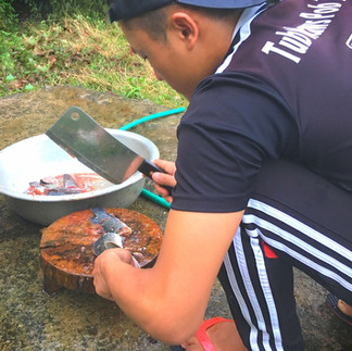 初日の夕食は、ナマズのぶつ切り煮込みでした。もち米と一緒に手で食べるスタイル。 コンロや水道はなく、地面にまな板を置いて魚をさばいている。 味がどう、というよりも、物理的な違いのインパクトが大きく、この場所で生き延びられるのか心配になりました(笑)。